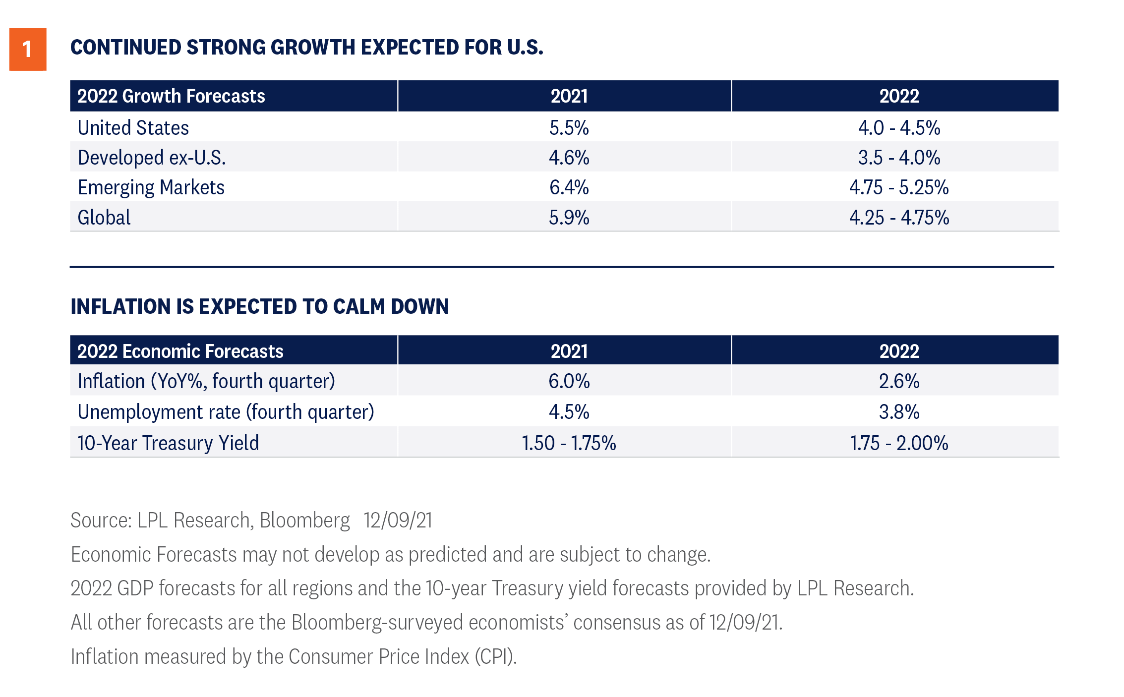 Globally, Europe and Japan were hit especially hard by the pandemic in 2021. But as COVID-19 cases potentially fall globally, those areas could be ripe for better economic growth in 2022. Meanwhile, emerging market economies may disappoint as growth in China could be constrained by regulatory crackdowns.