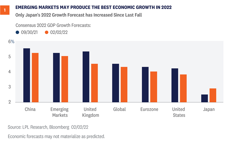 We expect developed international and U.S. economies to generate similar growth in 2022, though rising forecasts for Japan are encouraging. Europe may also see more benefit from pandemic-related pent-up demand as the region is earlier in its economic cycle than the U.S. And U.S. growth has gotten off to a slow start in the first quarter because of the Omicron variant.