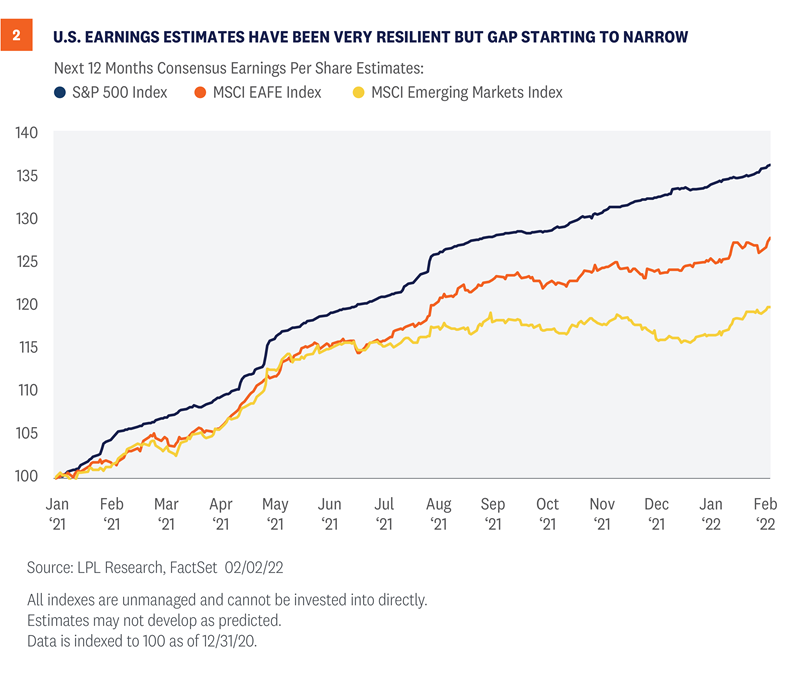 The U.S. comes into 2022 as the earnings favorite. Consensus estimates are calling for a 9% increase in S&P 500 earnings this year, ahead of the 5% and 7% increases expected for developed international markets and EM, respectively. As shown in Figure 2, U.S. earnings estimates have marched steadily higher over the past year, outpacing the increases outside of the U.S.