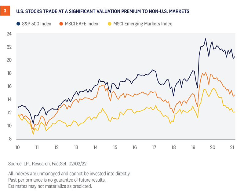 The valuation competition is the clearest cut. Figure 3 shows that U.S. stocks continue to trade at a significant premium to their international and EM counterparts and have for a long time.